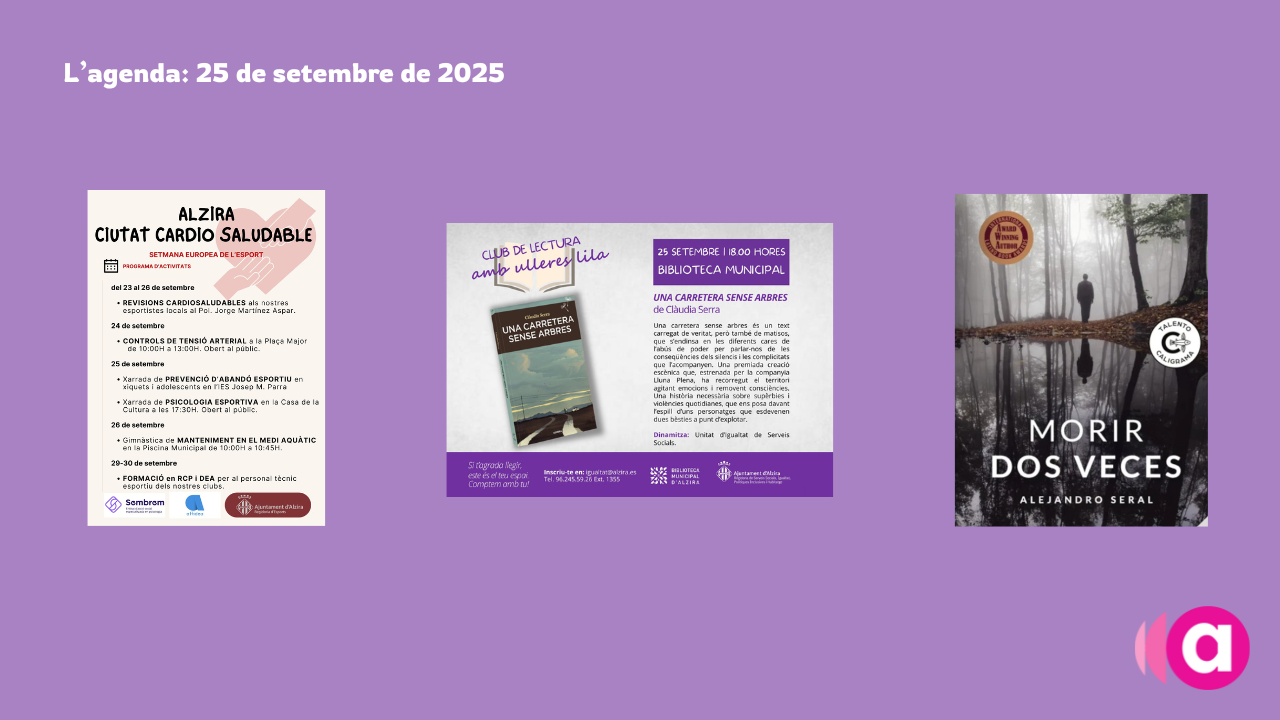 També a la Casa de la Cultura, a les 18:30 es posarà punt i final a la Setmana de l’Alzhèimer 2025 que ha organitzat l’Associació de Familiars d’Alzhèimer d’Alzira, amb la presentació de la novel·la Morir dos veces d’Alejandro Seral. Un llibre basat en l’experiència de l’autor i en com afrontà el diagnòstic d’Alzhèimer de son pare. En la presentació, a més, es projectarà el documental sobre el cas familiar de Seral i hi haurà un col·loqui posterior. L’entrada és gratuïta.