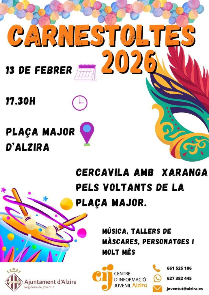 Els més joves gaudiran enguany també d’una festa de Carnestoltes. L’Ajuntament d’Alzira, a través de la Regidoria de Joventut, ha organitzat una nova edició de Carnestoltes que omplirà , música i diversió la Plaça Major demà divendres a partir de les 17.30 hores. La jornada arrancarà amb una cercavila amb xaranga pels voltants de la Plaça Major, que donarà pas a una vesprada plena d’activitats pensades especialment per al públic jove i familiar. El programa inclou música, tallers de màscares, animació amb personatges disfressats i una TikTok disco, amb coreografies i els temes més actuals per a fer ballar a totes i tots. A més, durant la vesprada es repartiran entre les persones assistents sucs i Cacaolat sense gluten, perquè puguen gaudir d’un berenar mentre participen en les activitats programades. La regidora de Joventut, Lara Ferrer, anima a totes les famílies a vindre disfressades i aposta per oferir activitats dinàmiques i actuals per als més joves.