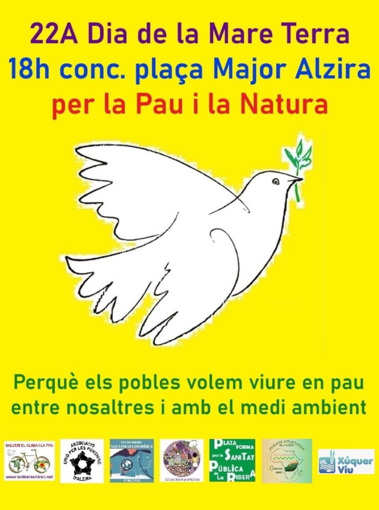 Hui és el dia de la Mare Terra. És per això que esta vesprada tindrà lloc una manifestació que es realitzarà a les 6 a la plaça Major, per la Pau i natura. Organitzen esta manifestació l’Associació Unió per les Pensions, el Col·lectiu 8M d’Alzira, la plataforma per la sanitat pública de la Ribera, la Taula per la convivència, Fuente Solidària d’Alzira, Xúquer Viu i la Ribera en Bici.