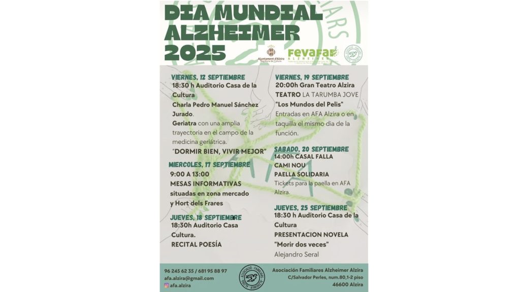 Este matí, l’associació AFARADEM ha commemorat el Dia Mundial de la Salut mental amb un acte que es va haver d’ajornar a causa de les fortes pluges que es produïren el passat 10 d’octubre. A l’acte, que s’ha realitzat a l’Ajuntament d’Alzira, s’ha llegit un manifest, també s’ha portat a terme una performance i ha comptat amb la participació del cor del CEIP Alborxí. Elena Arona, integrant de l’associació AFARADEM, ha recordat que estar fart, cansat o enfadat també és humà, i no sempre hem d’estar contents. En este sentit, Arona ha remarcat la importància de soltar els sentiments negatius que portem a dins perquè, segons apunta, la salut mental també es defén soltant i rient. Per cert, recordar que l’Ajuntament d’Alzira ha organitzat per al pròxim 6 de novembre la jornada Preparar, intervindre i reconstruir: una mirada des de la salut mental. Serà a la Casa de la Cultura, i durant el dia, a partir de les 9.00 hores fins a les 14.30 hores, es portaran a terme diferents xarrades sobre la salut mental i l’impacte en emergències com la dana.