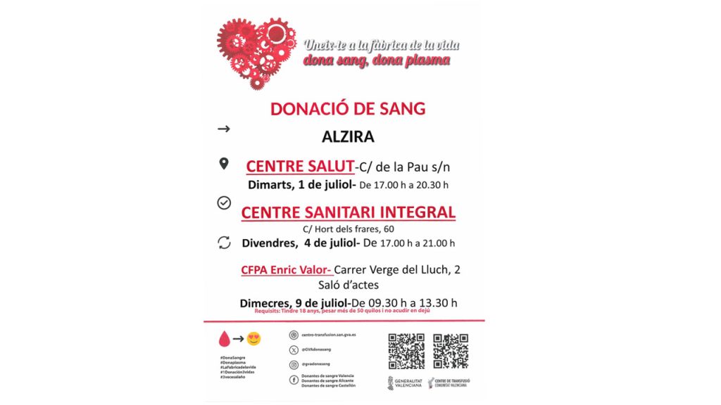 Després de la jornada del passat dimarts, Alzira acull hui un nou punt de donació de sang dins de la campanya d’estiu que ha preparat el Centre de Transfusió de la Comunitat Valenciana. El punt de donació estarà habilitat de 17:30 a 21:00 al Centre de Salut del carrer Hort dels Frares per a aquelles persones que vulguen donar. Recordem que la donació de sang és essencial, no sols per a urgències com accidents de trànsit o cirurgies d’emergència, sinó també per a malalts crònics. Per a ser donants cal ser major d’edat i pesar més de 50 quilos. I recorden no anar en dejú. Pots escoltar l’informatiu sencer ací: