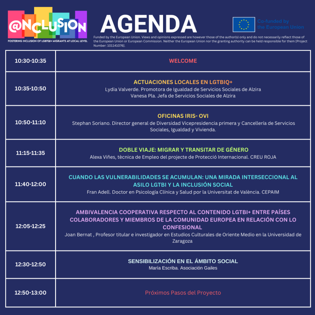 L’Ajuntament d´Alzira va celebrar dimecres l’esdeveniment Nacional Online del projecte europeu @nclusion, una jornada centrada en la inclusió de les persones LGBTIQ+ migrants i refugiades a nivell local, que ha reunit a administracions públiques, entitats socials, universitat i professionals especialitzats de diferents punts del territori. La trobada, desenvolupada en format online, ha servit com a espai de reflexió, intercanvi de bones pràctiques i diàleg al voltant dels reptes principals que afronten les persones LGBTIQ+ migrants en els processos d’acollida, protecció internacional i inclusió social. Durant la jornada s’abordaren qüestions clau com el desenvolupament de polítiques públiques inclusives des de l’àmbit autonòmic i municipal, la importància dels serveis d’acompanyament jurídic, psicològic i social per a persones LGBTIQ+ migrants i refugiades, les dificultats d’accés a l’habitatge, l’ocupació i la regularització administrativa o la necessitat de generar espais segurs i respostes específiques davant de situacions de discriminació múltiple.