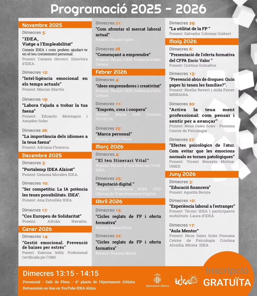Idea ha iniciat este mes de novembre de nou el cicle de monogràfics. Un cicle que porta en marxa 14 anys i que s’ha consolidat com una eina de formació oberta a tota la ciutadania i que ha comptat amb l’assistència de 1500 persones anualment, segons les dades de l’agència municipal. Els monogràfics són sessions de formació que es fan cada dimecres a partir de novembre i fins al mes juny en el saló de plens de l’Ajuntament. En estes sessions es tracten temes relacionats amb l’ocupació, l’emprenedoria, les mobilitats europees, les eines per a millorar l’accés laboral, etc. Temes que són explicats per experts de diverses organitzacions i empreses especialistes. Per exemple, este dimecres serà un tècnic de Labora el que explicarà que t’oferixen per a millorar la teua feina. Al llarg dels pròxims mesos, es tractaran temes ben diversos que avançava la tècnica d’Idea, Teresa Pons. Cada sessió de monogràfics dura un hora i es pot accedir gratuïtament, prèvia inscripció, a la pàgina d’Idea, de forma presencial o a través de Youtube. El programa que va començar en 2011 ha realitzat al llarg dels anys 350 sessions de formació i ha abastat a gran part de la població alzirenya. La pròxima sessió serà este dimecres 19 a les 13 hores al saló de plens en la quarta planta de l’Ajuntament. La inscripció es pot fer a través de l’adreça: https://www.idea-alzira.com/monograficos.