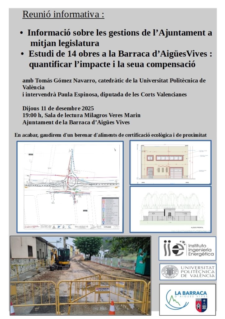 I també esta vesprada, a partir de les 19.00 hores, a la Sala de lectura Milagros Veres Marin, a l’Ajuntament de la Barraca d’Aigües Vives, es durà a terme una reunió informativa sobre les gestions del consistori a mitjan legislatura i també sobre l’impacte ambiental de 14 obres a la Barraca d’Aigües Vives. En concret, es presentarà un estudi sobre l’impacte medioambiental que provoquen 14 obres a la Barraca i de quina manera es pot contrarrestar amb accions com la plantació d’arbres. Comptarà amb la presència de Tomás Gómez Navarro, catedràtic de la Universitat Politècnica de València i amb Paula Espinosa, diputada a les Corts Valencianes. Gómez Navarro, en declaracions a esta emissora, explica que atenent a les característiques de la Barraca d’Aigües Vives caldrien 150 anys per contrarestar l’impacte d’estes 14 obres. En acabar, hi haurà berenar per als assistents amb aliments de certificació ecològica i de proximitat.