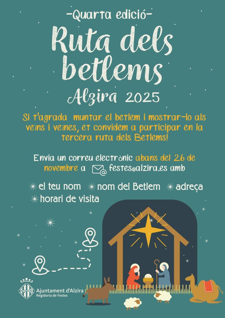 Hui és l’últim dia per a inscriure’s en la ruta dels Betlems. Inscripció lliure per tal que el teu naixement forme part de la ruta que l’Ajuntament fa pública perquè són Betlems que volen rebre visites. Si t’agrada muntar el betlem i mostrar-ho als veïns i veïnes, pots participar en esta quarta ruta dels Betlems, junt amb aquells betlems que es troben en edificis públics. Si vols participar, has d’enviar un correu electrònic a festes@alzira.es amb el teu nom, el nom del Betlem, l’adreça i l’horari de visita que tu establisques. Recorda que hui és l’últim dia per a participar.