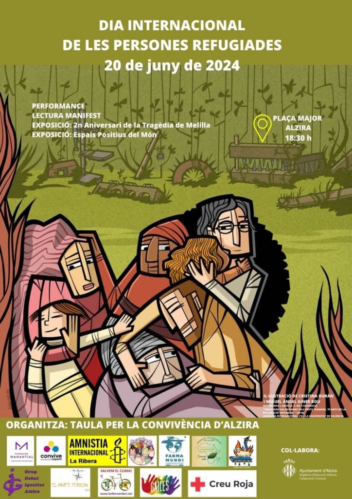 Alzira commemora hui el Dia Mundial de les Persones Refugiades. La Taula per la Convivència d’Alzira ha organitzat un acte a les sis i mitja en la plaça Major, que consistirà en l’exposició “Punts clau sobre la tragèdia de Melilla”, la lectura d’un manifest i una performance dirigida per l’associació Balloona Matata. El 20 de juny va estar declarat per les Nacions Unides Dia Mundial de les Persones Refugiades amb l’objectiu de fer visible la situació dramàtica que viuen al món milions de persones que es troben fora del seu país d’origen per temor a la persecució, al conflicte o a la violència generalitzada i, en conseqüència, requereixen de protecció internacional. Com a resultat de les guerres, el canvi climàtic i les enormes desigualtats, actualment al voltant de 80 milions de persones s’han vist desplaçades a la força. Hi ha uns 26 milions de persones refugiades en el món, el major nombre registrat mai, i el 85% es troba en països d’ingressos baixos i mitjans. Des de la Taula per la Convivència, es vol dedicar esta jornada a recordar el primer aniversari de la tragèdia a la frontera de Melilla, ara fa un any, que ha provocat nombroses denuncies per part de les associacions humanitàries. La Taula per la Convivència d’Alzira seguix sumant esforços amb accions de promoció de la justícia social, i està formada pels col·lectius El Norte Perdido-Sin Rumbo, Fundació Cepaim, EncuentraTe, Creu Roja, Grup de Debat per la Igualtat, Ribera en Bici-Ecologistes en Acció, Fundació Manantial, Fuente Solidaria, Farmamundi i el Grup la Ribera d’Amnistia Internacional.